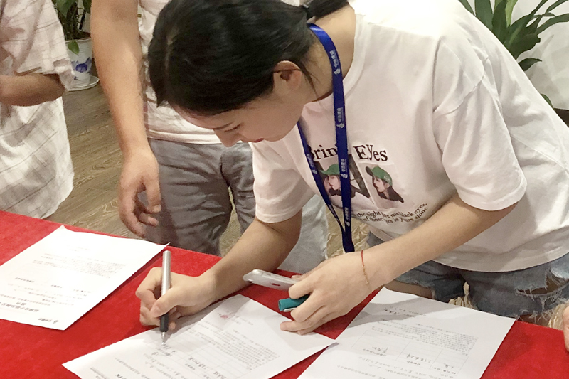 随后,公司8个品牌分小组均确认了各自的PK对象,并派出代表现场签订品牌分PK战书,协定对赌条件。