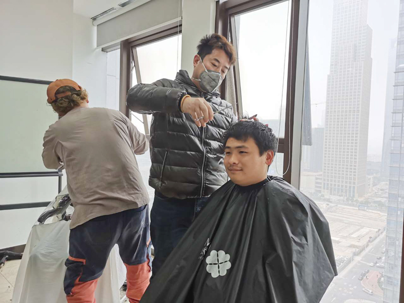 疫情期间,很多员工特别是男员工没理发,头发都变成了“爆炸式”,还特别油腻。2月28日,公司专程邀请了两位专业发型师——Tony老师和他的搭档上门服务,为近20名员工理发,确保他们在工作时能有个清爽的发型。