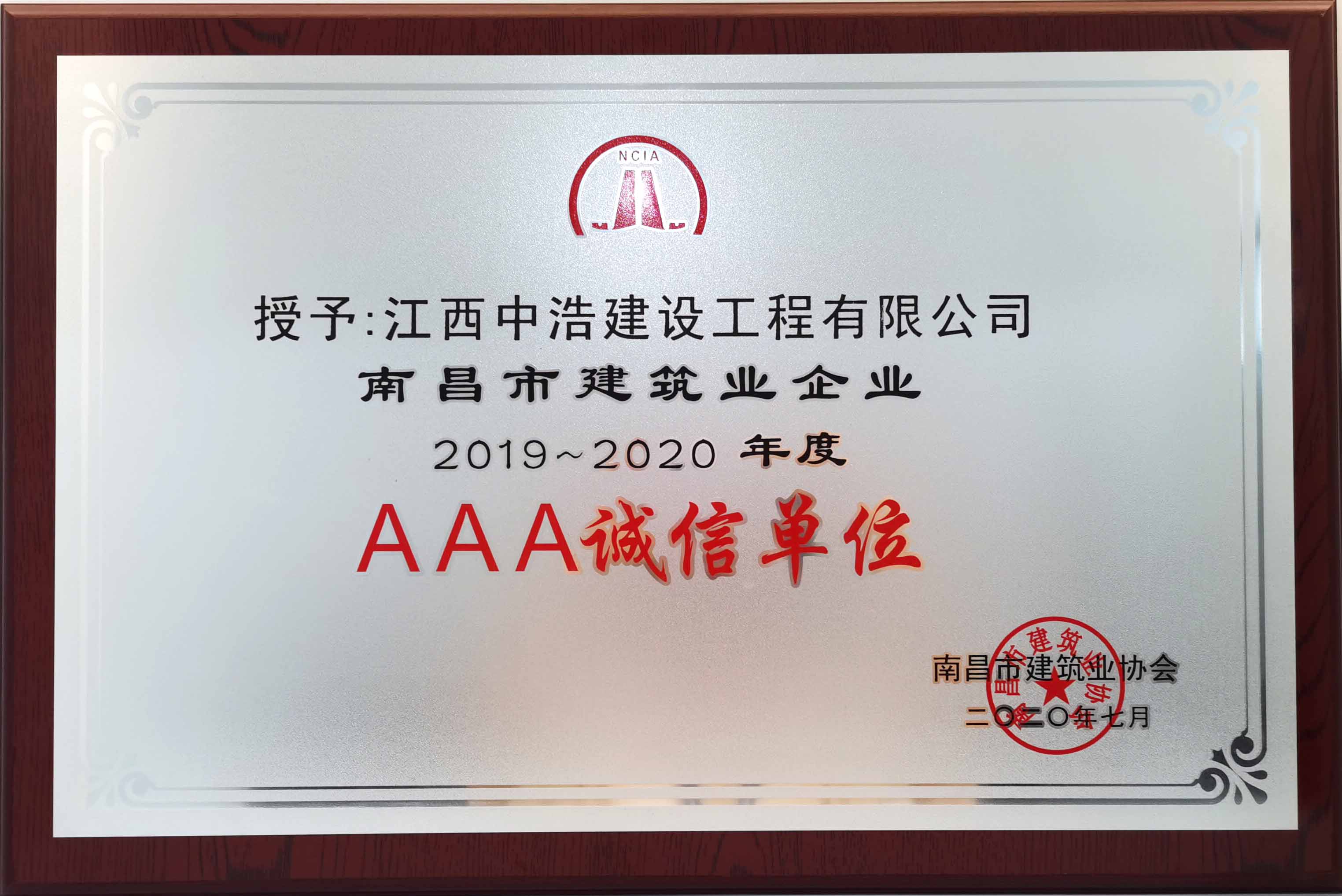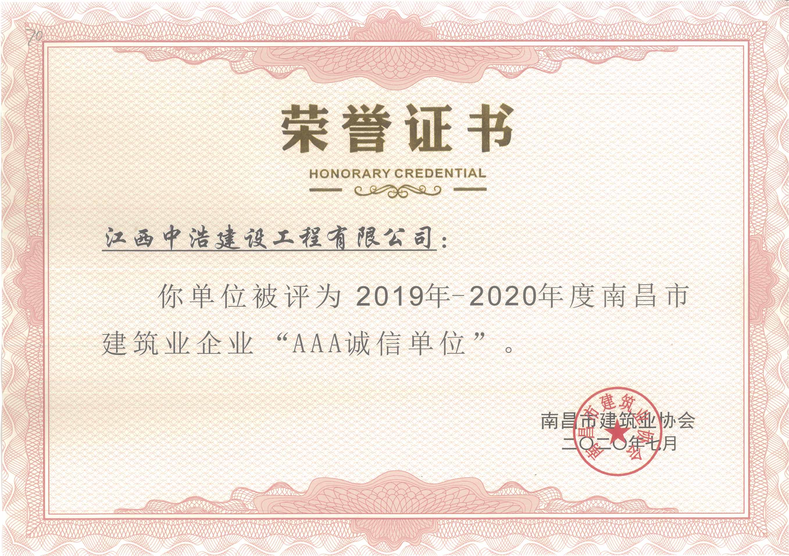 喜讯︱中浩建设荣获“南昌市建筑业企业2019-2020年度AAA诚信单位”称号