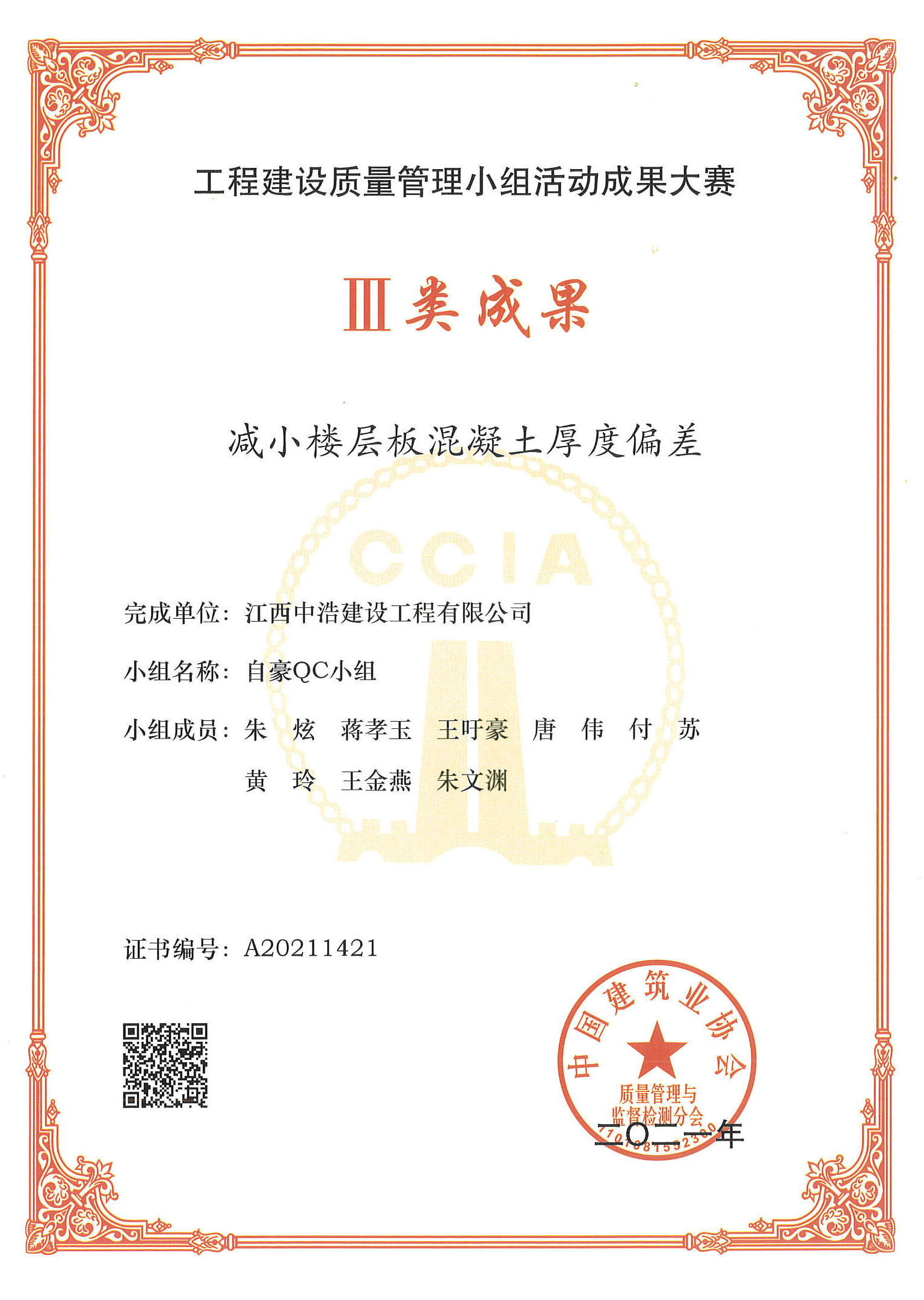近日,中浩建设在中国建筑业协会举办的2021年工程建设质量管理小组活动成果大赛中再创佳绩,公司自豪QC小组报送的《减小楼层板混凝土厚度偏差》课题荣获国家级工程建设质量管理小组活动Ⅲ类成果奖项。