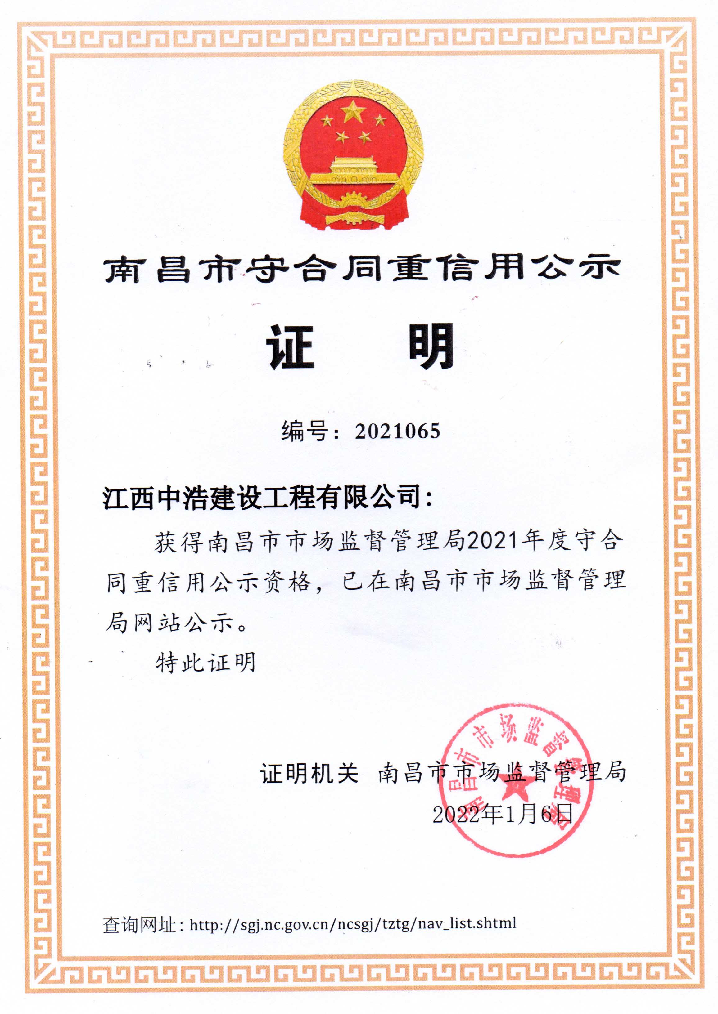 近日,南昌市市场监督管理局公示了“2021年度守合同重信用”企业名单,中浩建设成功入选。