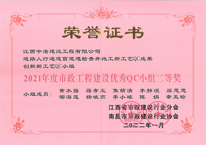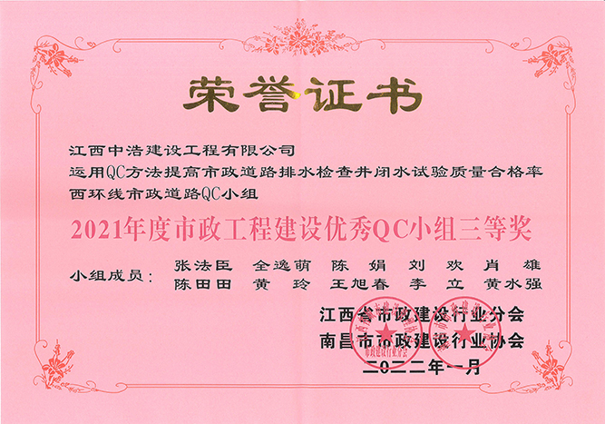 据悉,此次评选根据《市政工程建设质量管理小组活动评选办法》,评审专家秉承公平、公正、公开的原则,经过严格评审后,在现场公布评选结果。最终,中浩建设选送的QC成果喜获佳绩。其中,创新新工艺QC小组发布的《道路人行通道盲道遇检查井施工新工艺QC成果》荣获2021年度市政工程建设优秀QC小组二等奖,西环线市政道路QC小组发布的《运用QC方法提高市政道路排水检查井闭水试验质量合格率》荣获2021年度市政工程建设优秀QC小组三等奖。