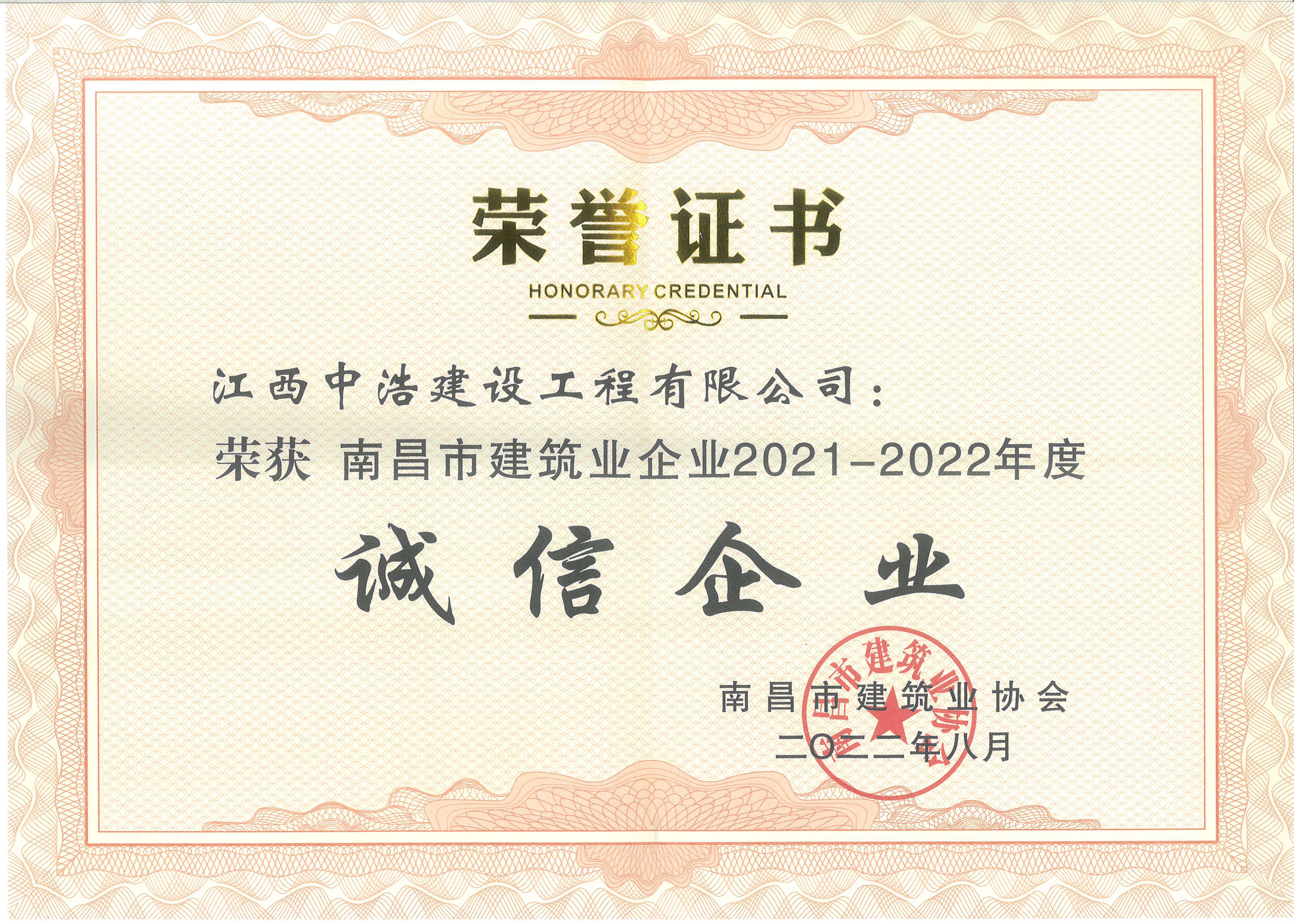 喜报︱中浩荣获“2021-2022年度南昌市建筑业诚信企业”荣誉称号