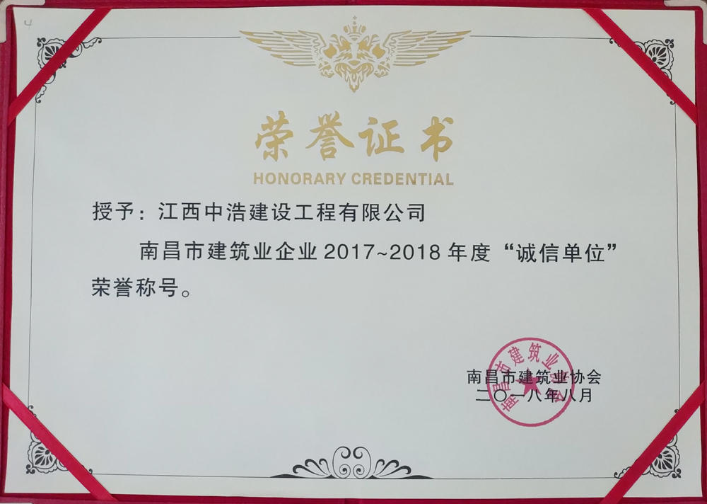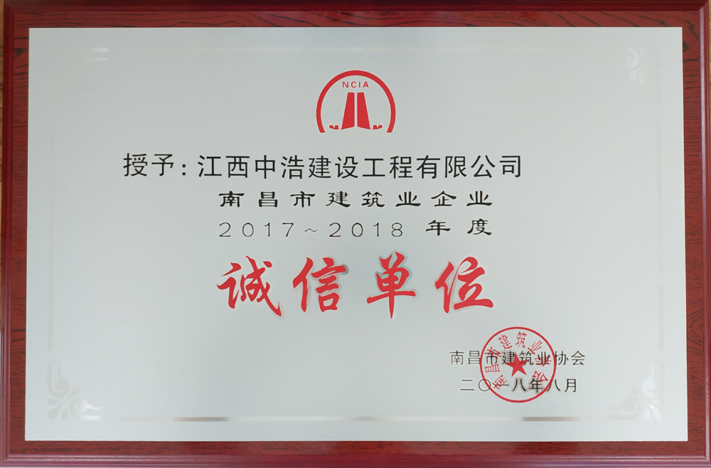 近日,由南昌市建筑业协会组织的2017-2018年度南昌建筑业企业诚信评价活动结果揭晓,经过企业申报、协会审核,我司荣获“南昌市建筑业企业2017-2018年度诚信单位”称号。